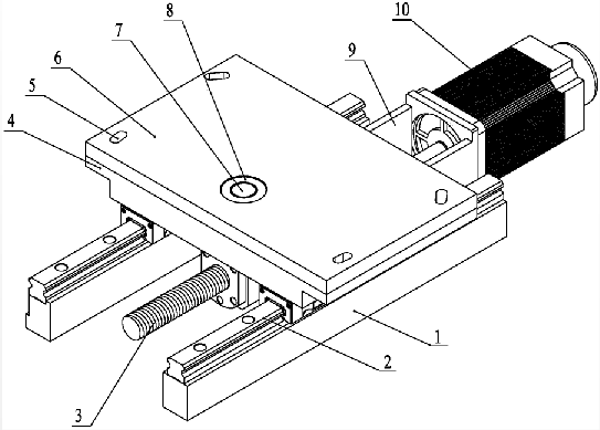 1:線軌座;2.線性滑軌;3.絲桿螺母副 4.滑臺板;5.安裝孔;6.電主軸角度板7.定位軸;8.軸承;9.電機座;10.進給電機;